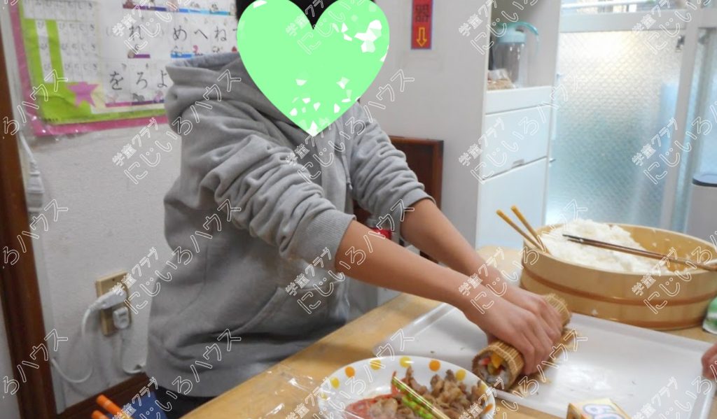 子ども達は、まきすを上手に使って自分好みの恵方巻を作ることが出来ました😊